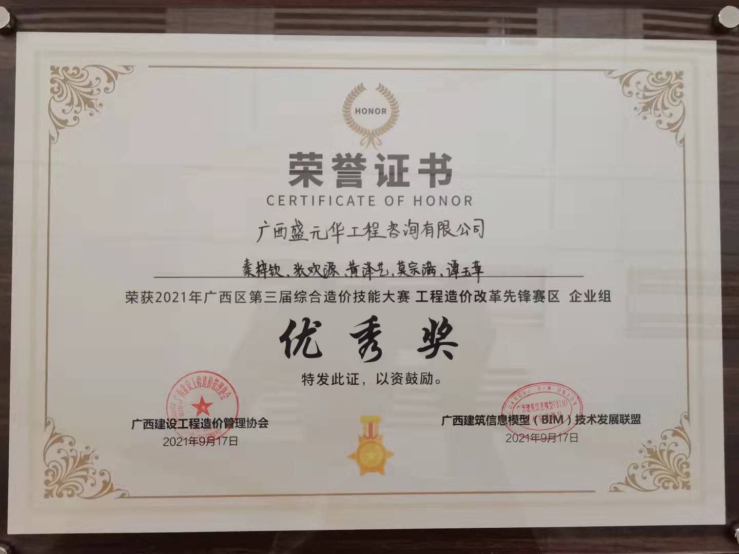 2021年廣西區第三屆綜合造價技能大賽(以下簡稱“大賽”)的系列比賽已全部結束,在9月17日的頒獎典禮上,公司參賽團隊以優異的成績在本屆技能大賽中再次收獲榮譽:榮獲工程造價改革先鋒賽區個人組第一名和企業組優秀獎、企業數字化開拓者賽區企業組三等獎。